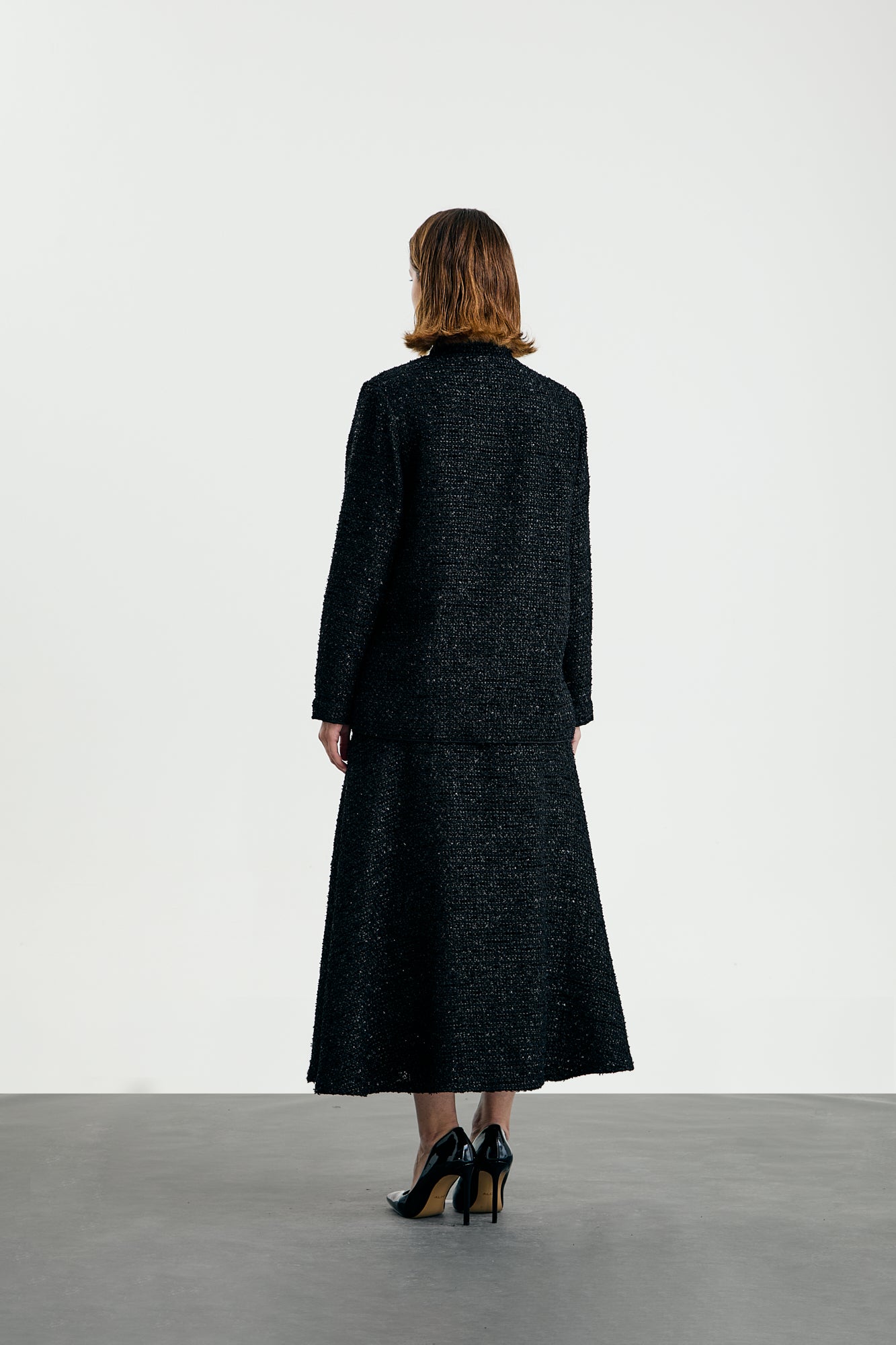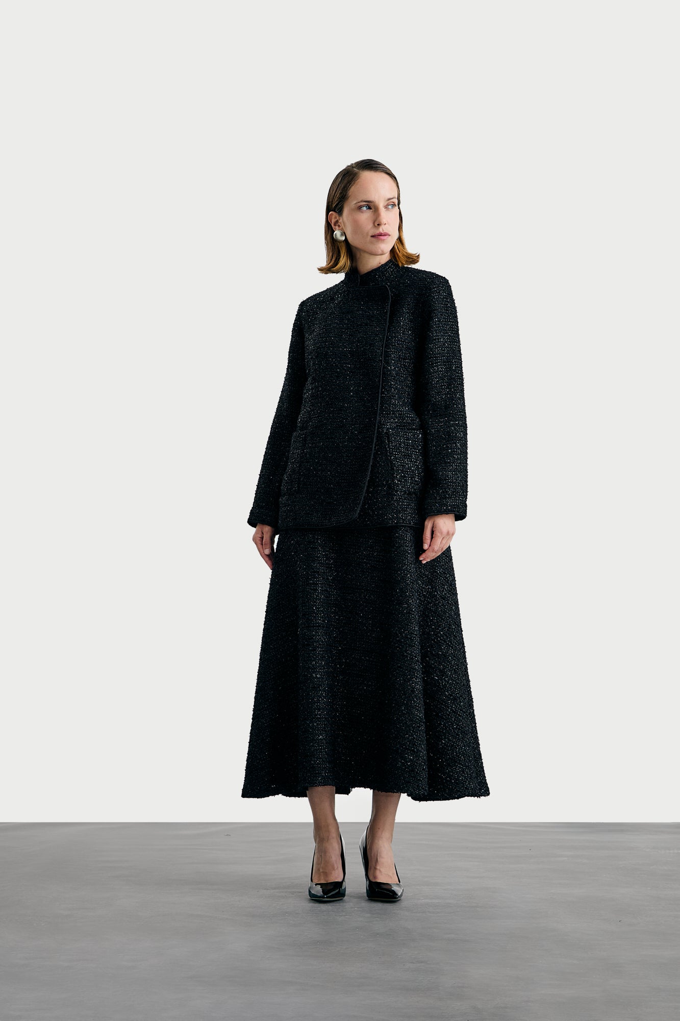 Nami translates to “enhance” referencing the flattering shapes. Tweed Skirt. The agal threads are stitched around the waist to emphasis the wearers waist.